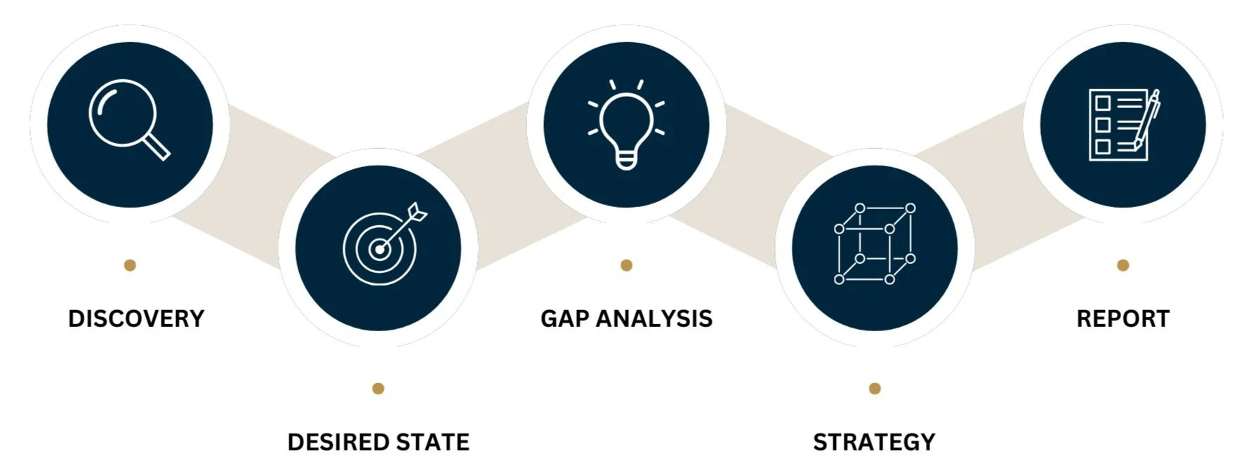Our Strategic Assessments follow our proven 5-step process designed to evaluate your IT and cybersecurity posture. It delivers a clear picture of your current state, benchmarks of control maturity, a future-state risk-aligned vision, and a prioritized roadmap for remediation, compliance readiness, and cyber insurability. The outcome: actionable insight that strengthens decision-making and positions IT and cyber as strategic enablers of performance, protection, and progress.